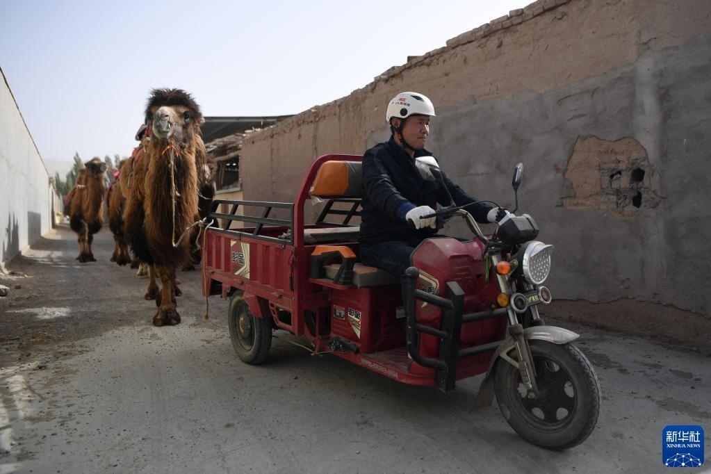 曹文華騎著三輪車帶著駱駝“下班”(4月24日攝)。   新華社記者 方欣 攝