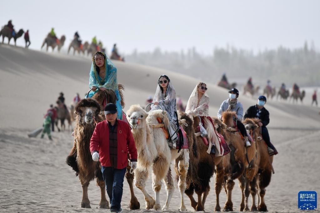 游客騎著駱駝在鳴沙山月牙泉景區(qū)游覽(4月29日攝)。   新華社發(fā)(張曉亮 攝)