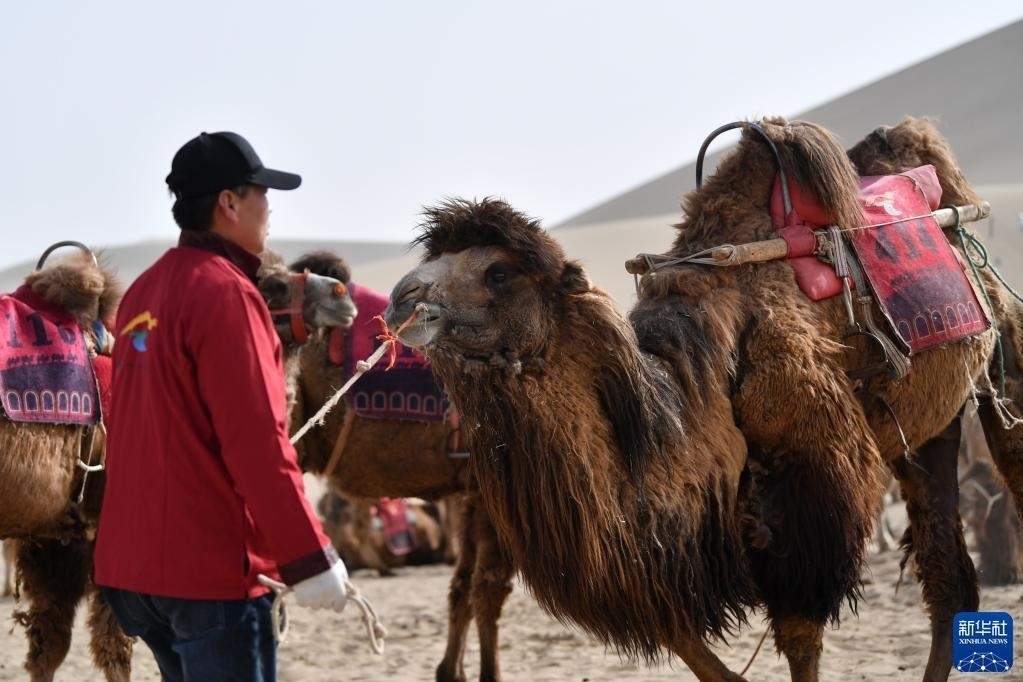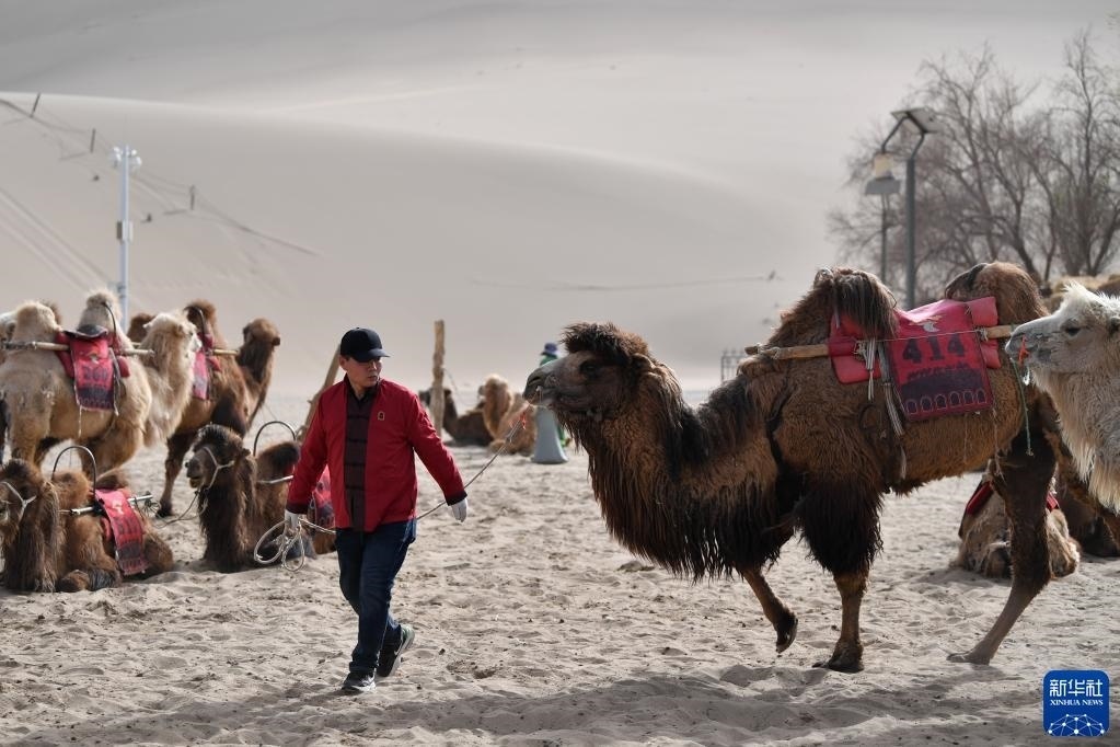 曹文華牽著駱駝在鳴沙山月牙泉景區(qū)駱駝騎乘點(diǎn)等待游客(4月24日攝)。   新華社記者 方欣 攝
