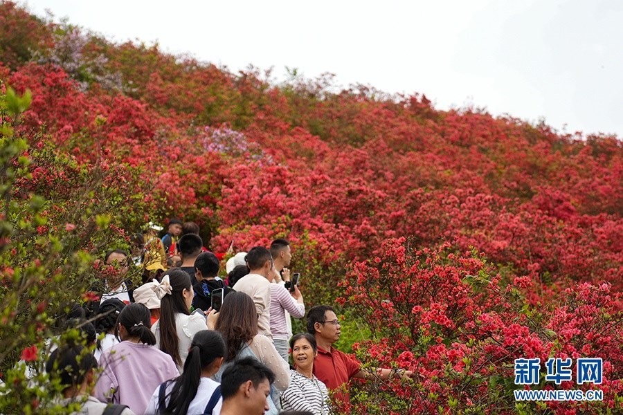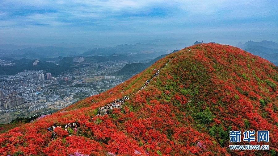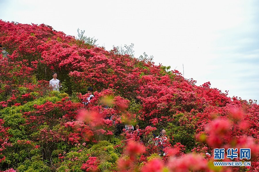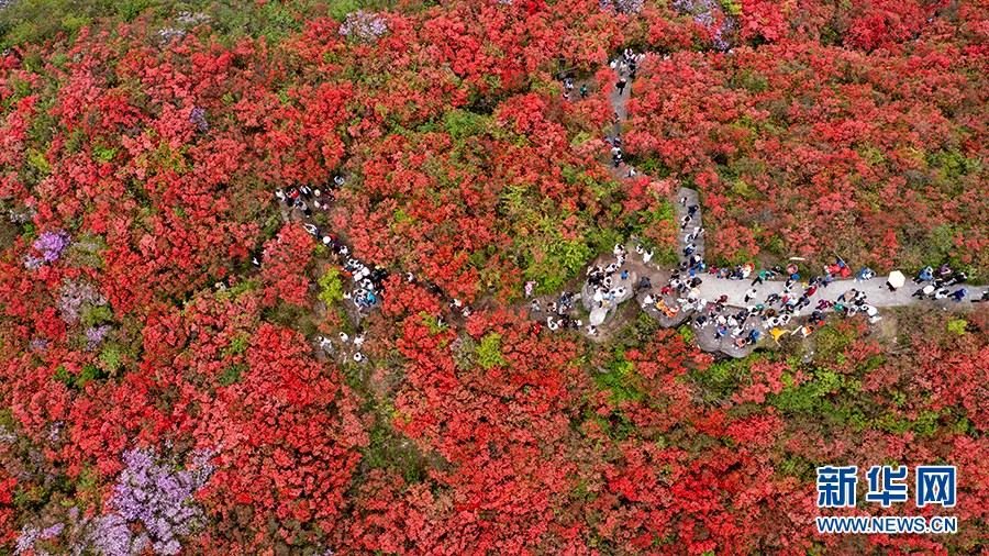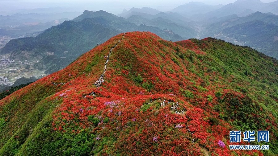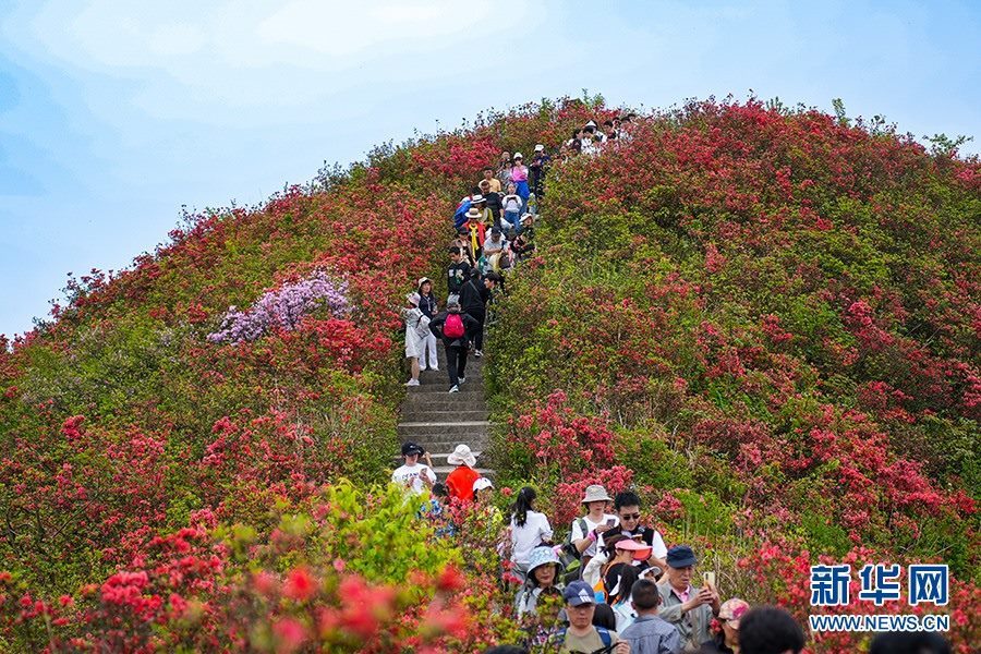 當(dāng)日,在貴州省黔東南苗族侗族自治州丹寨縣縣城邊海拔1400多米的龍泉山,萬(wàn)畝杜鵑花競(jìng)相綻放,山谷間、棧道旁、懸崖上,一顆顆、一簇簇、一朵朵杜鵑花迎風(fēng)搖曳,形成浩瀚花海,引來眾多游客登高望遠(yuǎn),飽覽靈山秀水之美。