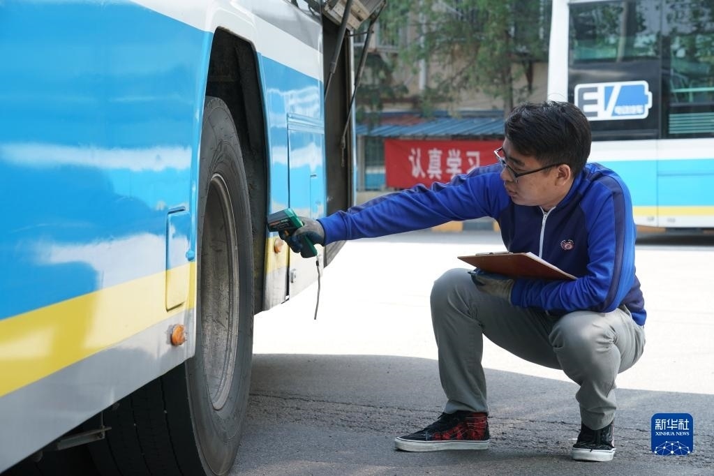 5月1日,在位于北京市朝陽區(qū)的柳芳公交場站,技術(shù)員王陸斌對車輪測溫。   新華社記者 任超 攝