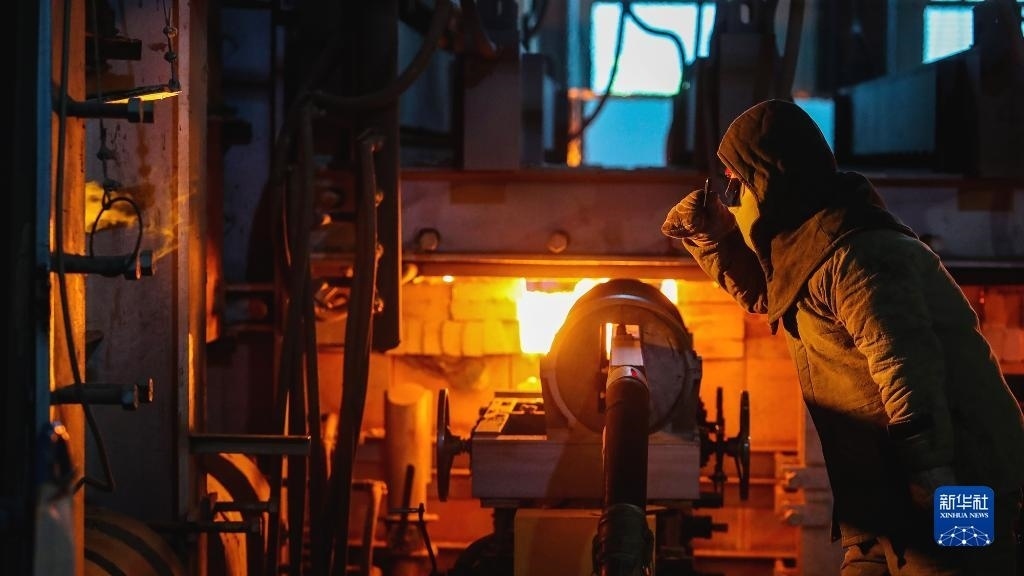 5月1日,在河南省商丘市睢陽區(qū)一家玻璃生產(chǎn)企業(yè),工人在車間觀察玻璃液熔制情況。   新華社發(fā)(李恒攝)
