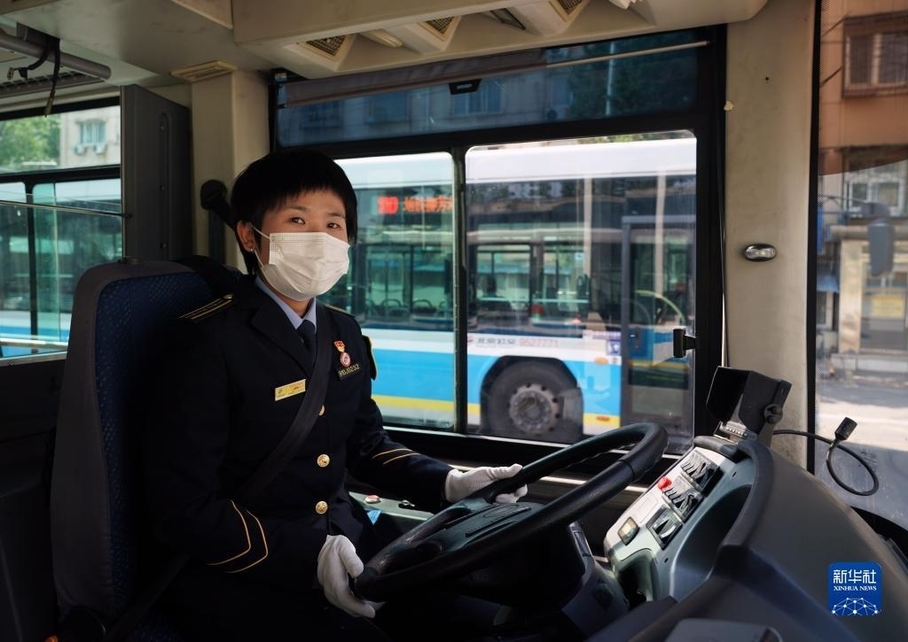 5月1日,在位于北京市朝陽區(qū)的柳芳公交場站,104路公交車駕駛員高國然駕駛車輛準(zhǔn)備駛出。   新華社記者 任超 攝