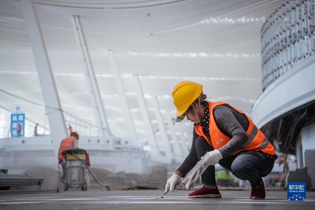 5月1日,在中建三局承建的武漢天河機場T2航站樓改造工程項目工地,工人在進行樓地面施工作業(yè)。   新華社記者 伍志尊 攝