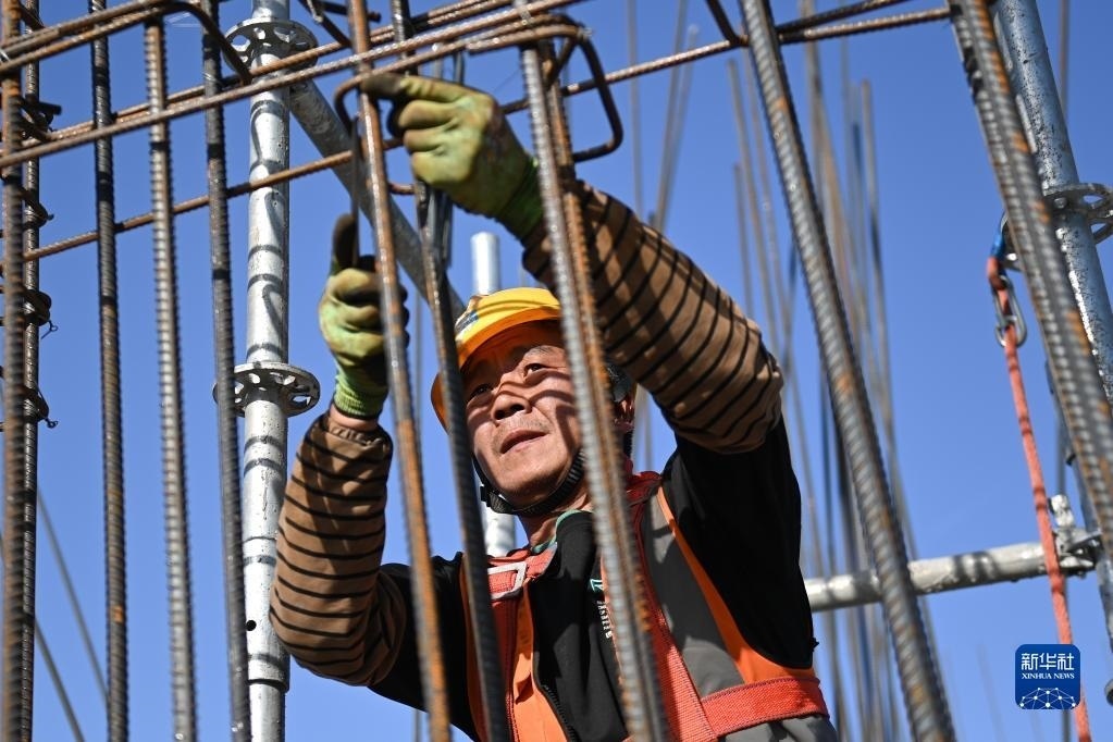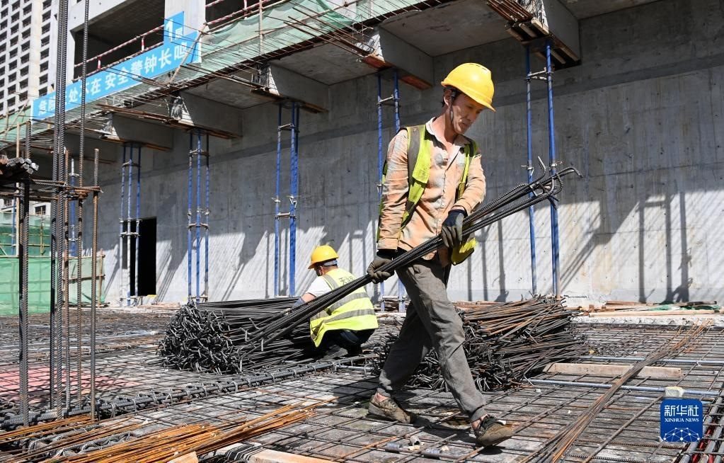 5月1日,工人在中建二局陜西分公司高鐵新城項目工地施工。   新華社記者 劉瀟 攝