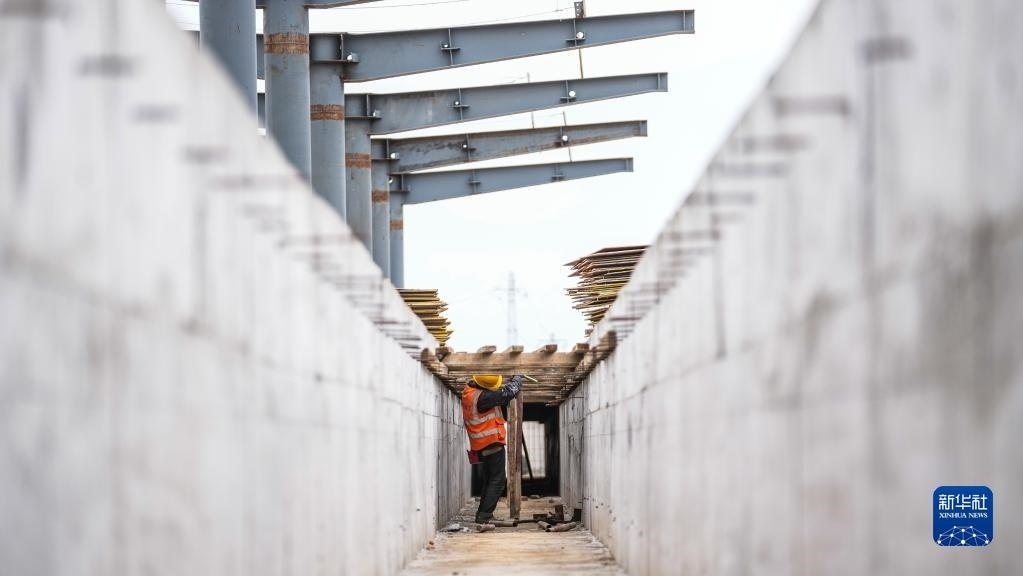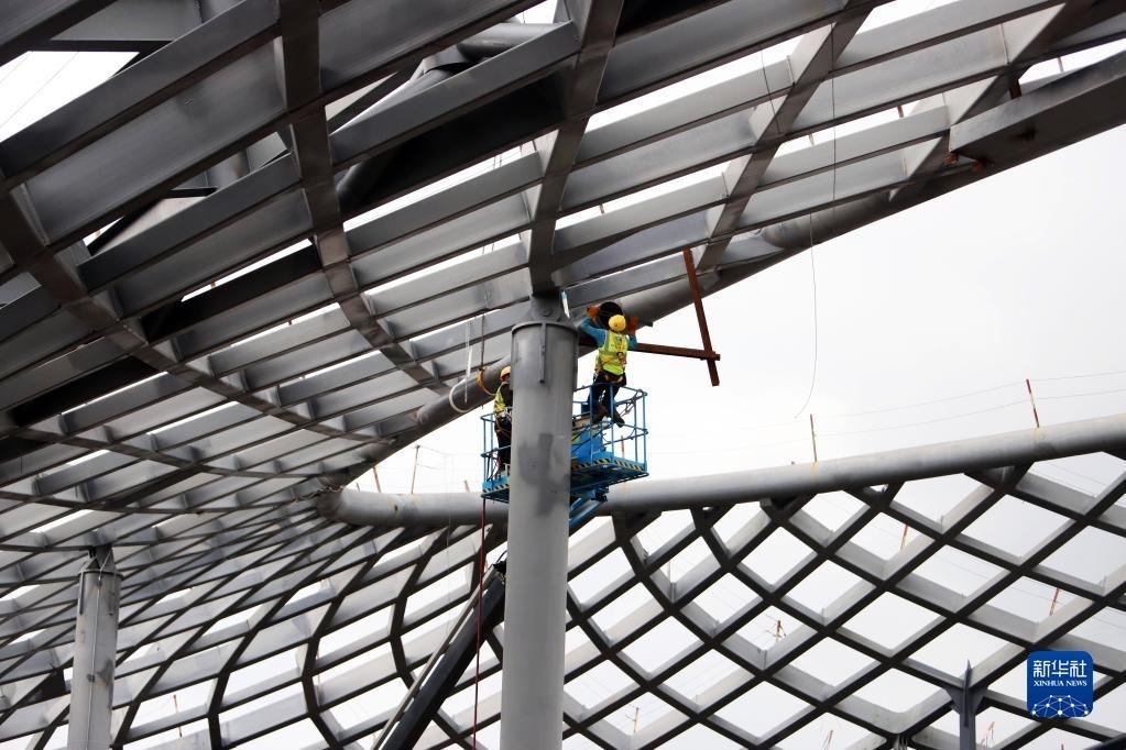 5月1日,中鐵建工集團工人在貴州貴安新區(qū)貴安站擴建項目工地施工。   新華社記者 陶亮 攝