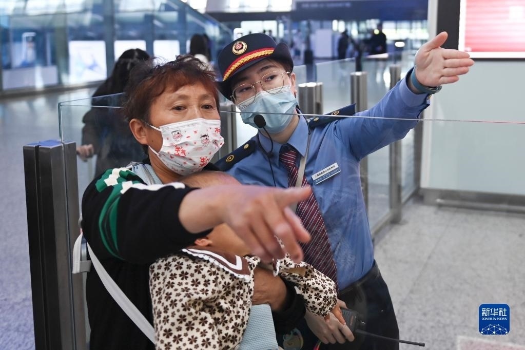 5月1日,在杭州東站候車大廳,客運員陳思悅引導(dǎo)旅客前往檢票口。   新華社記者 黃宗治 攝
