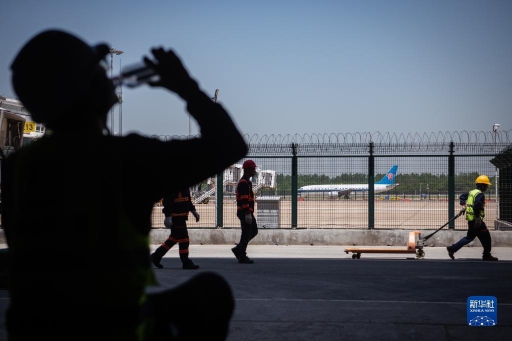 5月1日,工人在浙江省臺州市路橋機場改擴建項目施工現(xiàn)場施工。   新華社發(fā)(蔣友青攝)