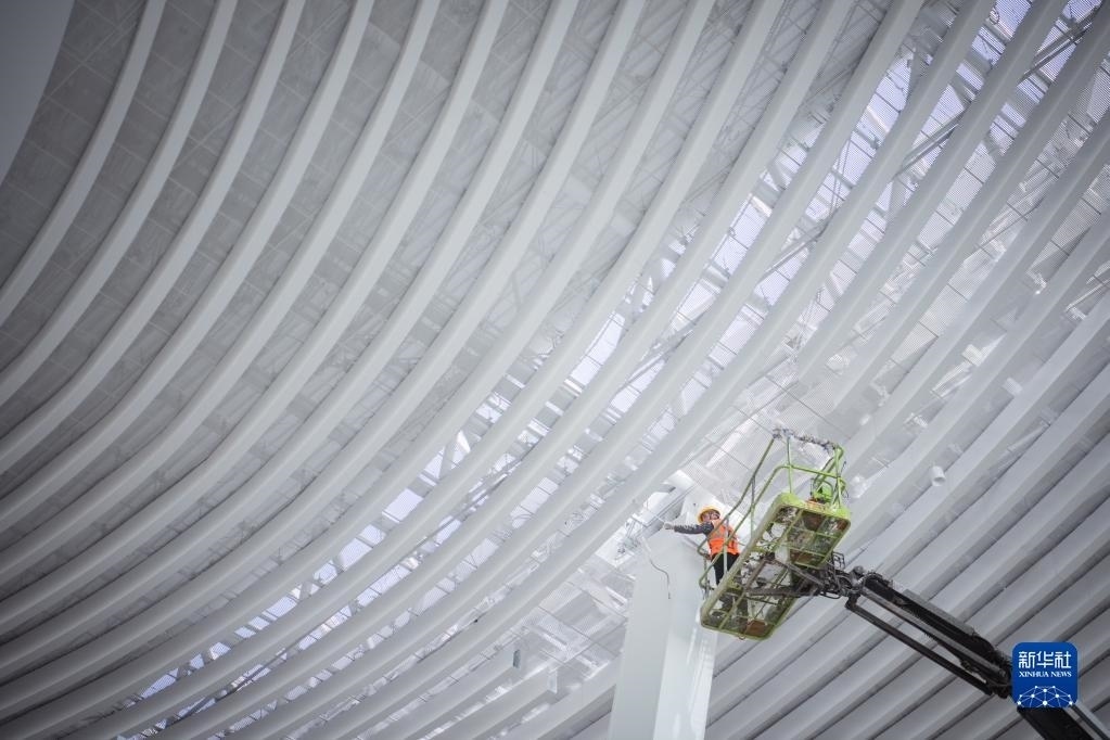 5月1日,在中建三局承建的武漢天河機場T2航站樓改造工程項目工地,工人在檢查吊頂內(nèi)管線。   新華社記者 伍志尊 攝
