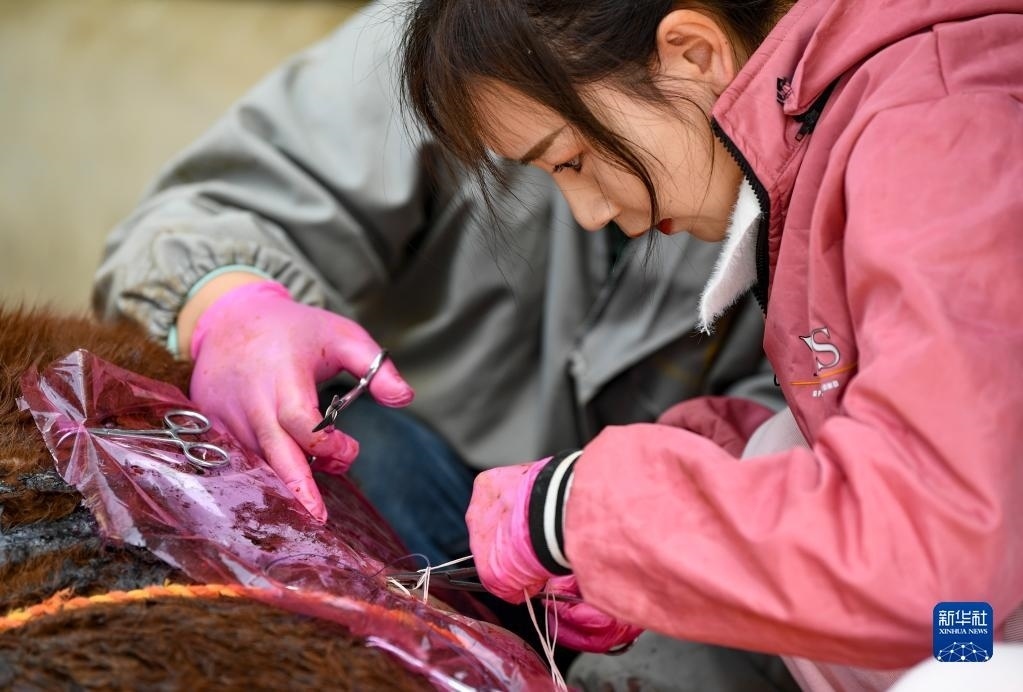 白婳在固原市原州區(qū)開城鎮(zhèn)雙泉村為村民李百武的一頭??p合傷口(4月18日攝)。   新華社記者 馮開華 攝