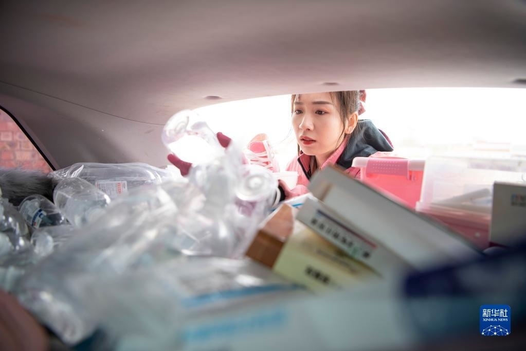 白婳從汽車后備箱里拿出藥品(4月18日攝)。   新華社記者 馮開華 攝
