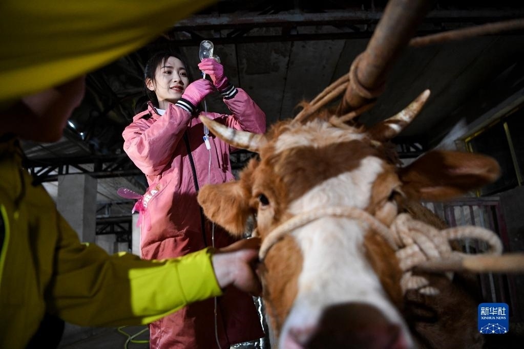 晚上10點(diǎn)多,白婳在固原市原州區(qū)開城鎮(zhèn)和泉村為一頭牛輸液(4月17日攝)。   新華社記者 馮開華 攝