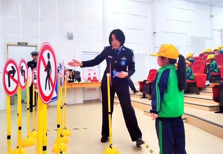 學(xué)警教同學(xué)識別交通道路標志牌。