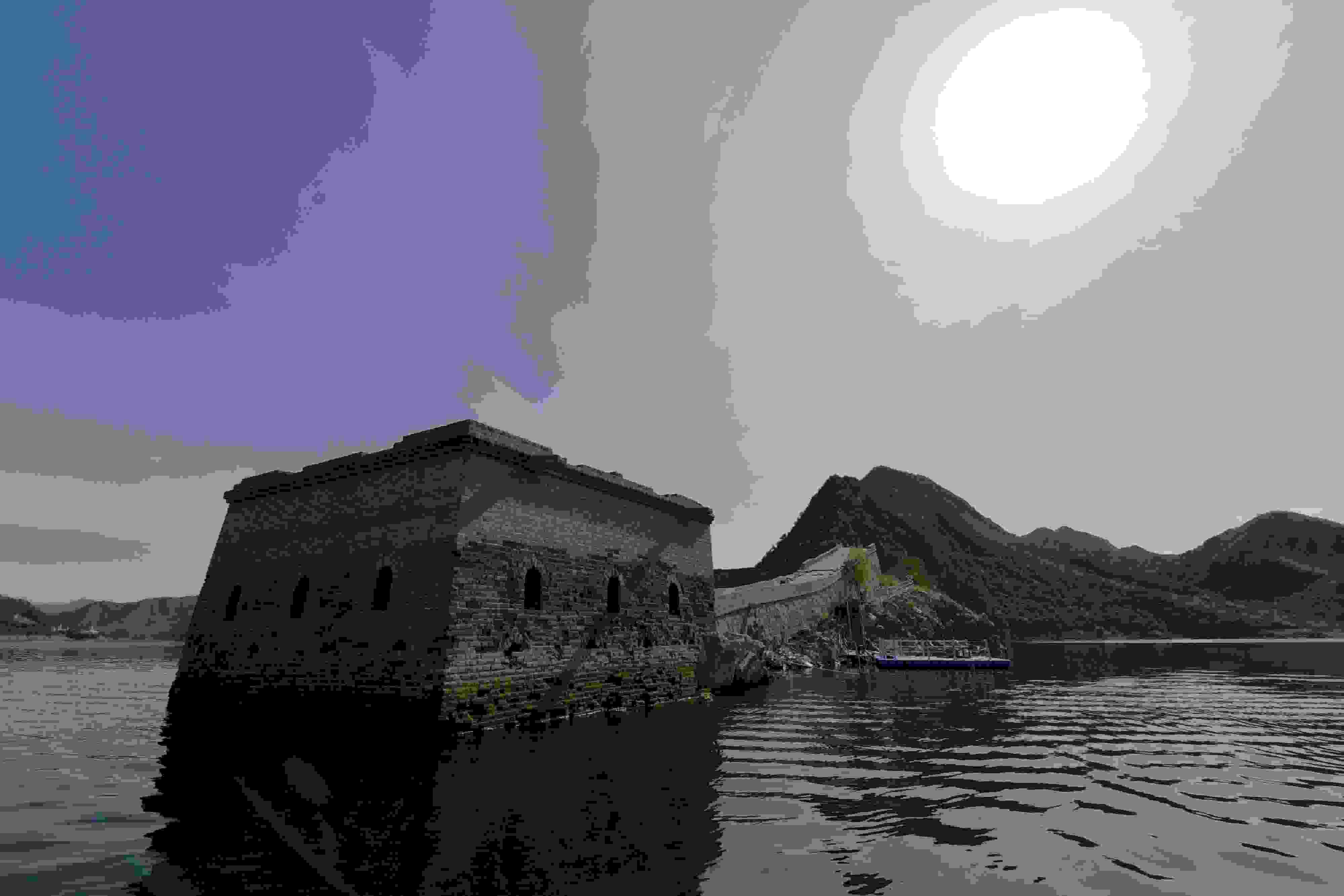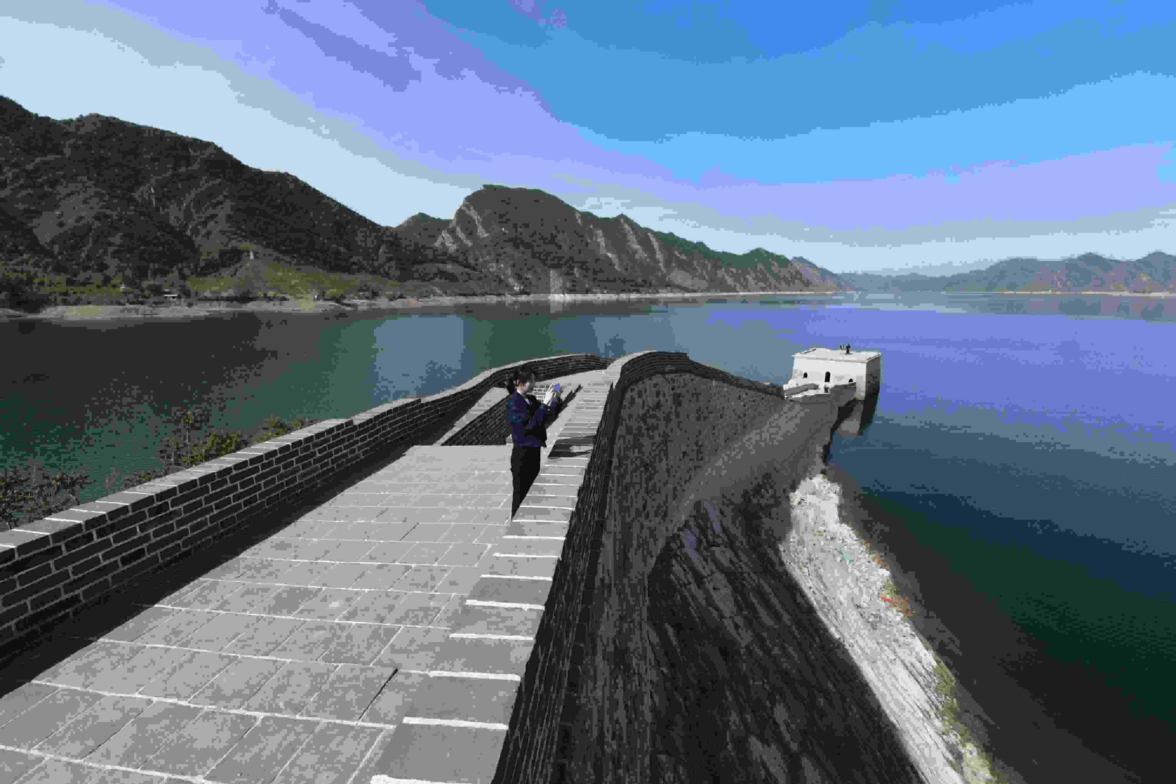 2023年5月8日,河北承德,寬城滿族自治縣境內潘家口水庫的“水下長城”。這段“水下長城”是明長城的遺址,20世紀70年代因建設水利樞紐工程,部分長城隱沒水下,從而形成“水下長城”景觀。 視覺中國