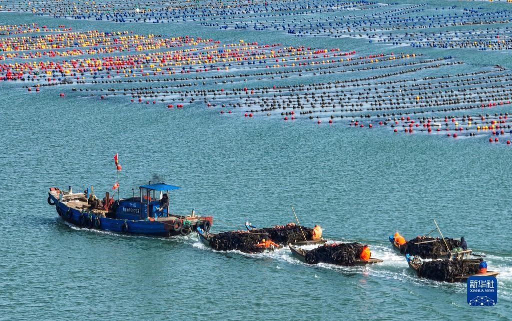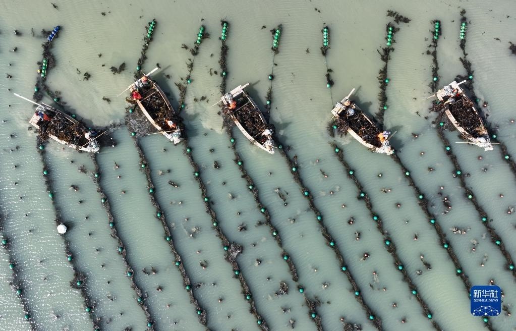 5月8日,在山東省榮成市愛(ài)倫灣海域海帶養(yǎng)殖區(qū),漁民采收海帶(無(wú)人機(jī)照片)。