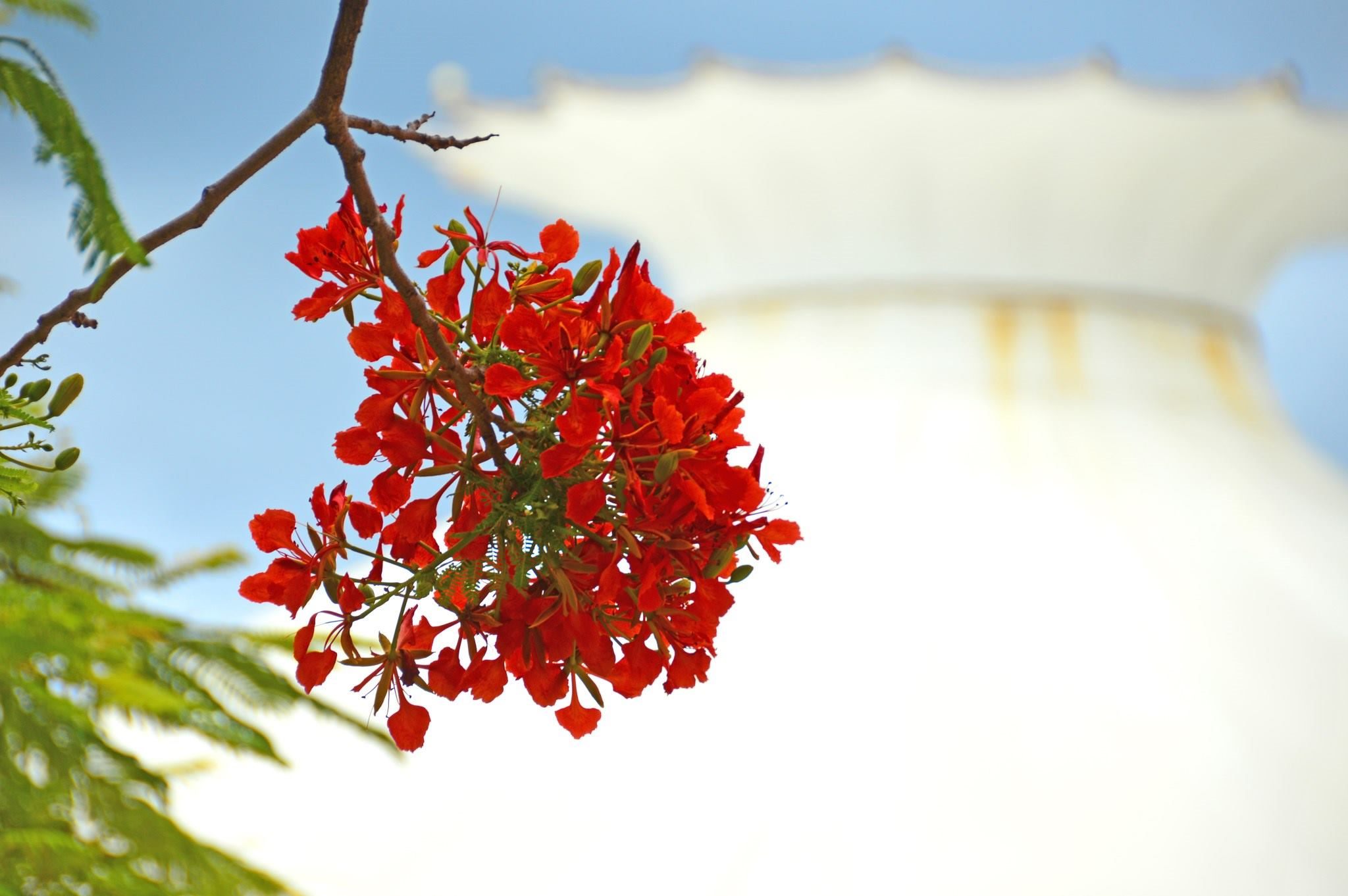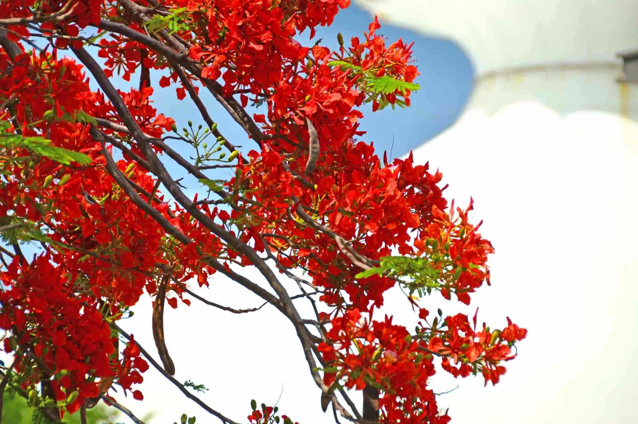 2023年5月9日,三亞,鳳凰路美麗之冠旁,一株株鳳凰樹綻放出紅艷艷的花朵。視覺中國(guó)