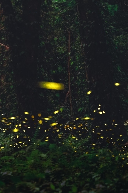 2023年5月7日,夜幕降臨,廣州華南植物園內(nèi)蘇鐵園前,螢火蟲在林間飛舞。 視覺中國