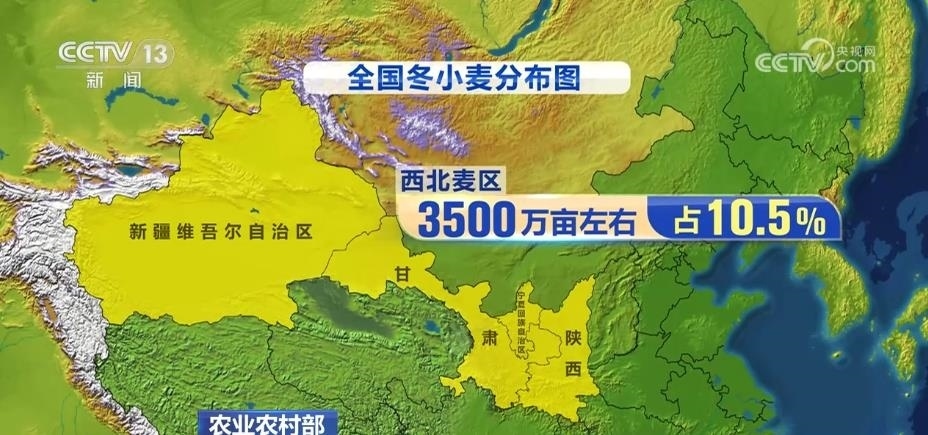 西北麥區(qū)包括陜西、甘肅、寧夏、新疆,冬小麥面積3500萬(wàn)畝左右,占10.5%。