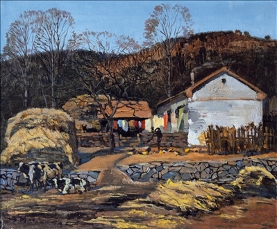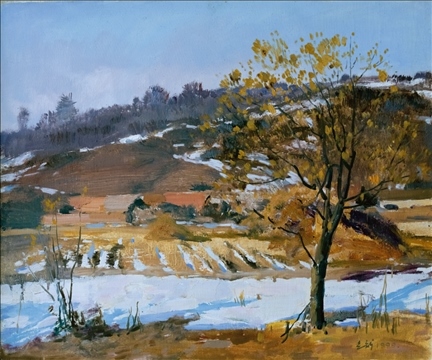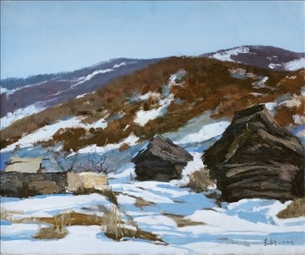 《激戰(zhàn)松骨峰》描繪的是抗美援朝戰(zhàn)爭中,中國人民志愿軍與美軍激烈廝殺的悲壯場面。作者從動態(tài)型的構(gòu)圖與形象表層,把戰(zhàn)爭集團(tuán)之間的搏殺以濃重的筆調(diào)展現(xiàn)開來,表現(xiàn)了中國人民志愿軍英勇頑強(qiáng)、熱愛自由和勇于犧牲的精神,展示了歷史的悲劇性沖突。作者從沉甸甸的歷史中找到戰(zhàn)爭中最慘烈、最殘酷、最能表現(xiàn)人物悲劇性命運的瞬間,用現(xiàn)實主義的創(chuàng)作手法,扎實、生動地塑造了一個又一個志愿軍勇士的形象。硝煙籠罩著戰(zhàn)場,鮮血與白雪融合成冰,敵我雙方,犬牙交錯,生死搏殺。同時,也使我們感受到戰(zhàn)爭的殘酷與生命的脆弱。作者處理宏大的戰(zhàn)爭場面獨具匠心:陽光透過硝煙,有節(jié)奏地營造出戰(zhàn)場的空間;雪地上被間隔的藍(lán)色陰影,反襯出黃褐色的主調(diào)。作品對細(xì)部進(jìn)行了恰如其分的刻畫,但又不失對整體宏觀的把握,厚重的色彩中透出熱情,樸拙的筆觸映著畫家的激動。