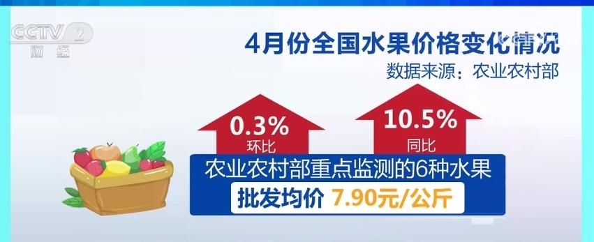 數(shù)據(jù)顯示,4月份,農(nóng)業(yè)農(nóng)村部重點監(jiān)測的6種水果批發(fā)均價每公斤7.90元,環(huán)比上漲0.3%,同比上漲10.5%。5月份以后,隨著天氣轉(zhuǎn)暖,南方的西瓜、甜瓜和華北、華中產(chǎn)區(qū)的櫻桃、草莓、桑葚等時令鮮果陸續(xù)進入收獲期,水果市場供應量和品種齊增。