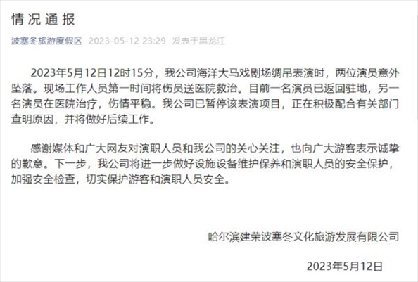 ·哈爾濱波塞冬旅游度假區(qū)就兩位演員在表演時(shí)意外墜落發(fā)布情況通報(bào),稱目前一名演員已返回駐地,另一名演員在醫(yī)院治療,傷情平穩(wěn)。