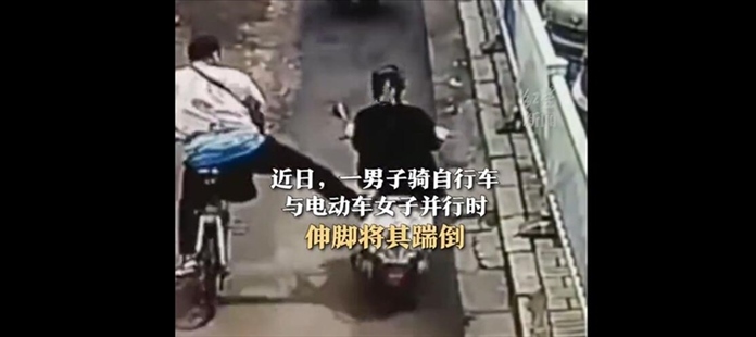 ·一男子騎自行車與一騎電動(dòng)車女子并行時(shí)伸腳將其踹倒。街道辦回應(yīng):事發(fā)后當(dāng)?shù)嘏沙鏊槿胝{(diào)查,當(dāng)事雙方已和解。