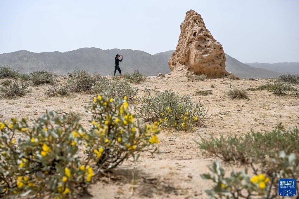 5月13日,駝峰(長城)文物保護(hù)隊員布音烏力吉在阿拉善左旗一處烽火臺遺址巡查并拍照記錄。
