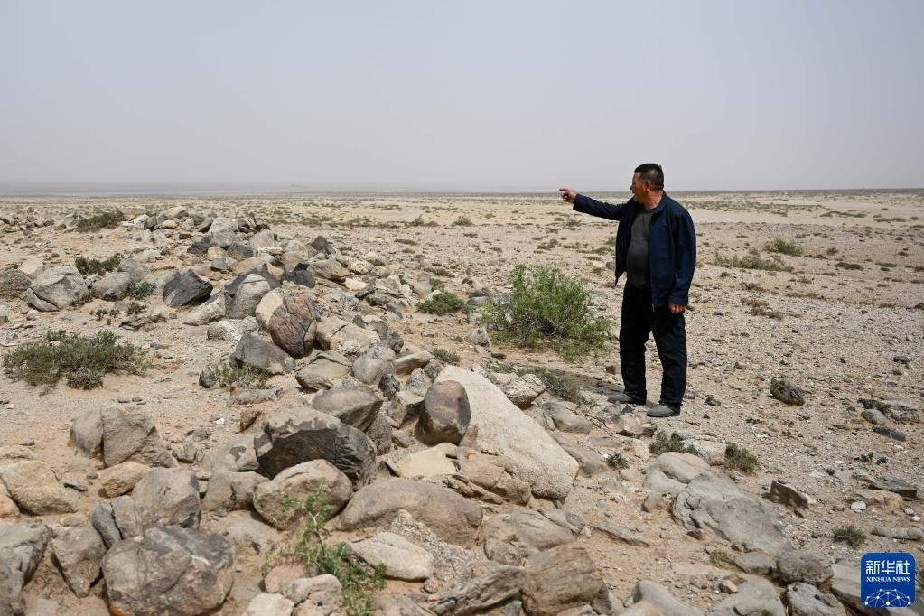 5月13日,駝峰(長城)文物保護(hù)隊員許繼龍在巡查阿拉善左旗一處石圈遺址。