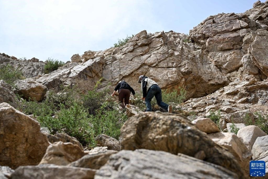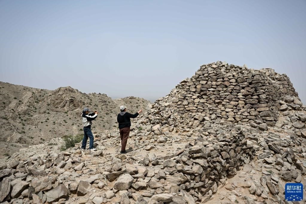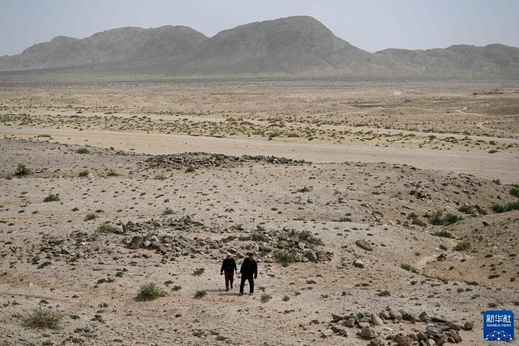 5月13日,駝峰(長城)文物保護(hù)隊員許繼龍(右)和烏仁其其格在巡查阿拉善左旗一處石圈遺址。