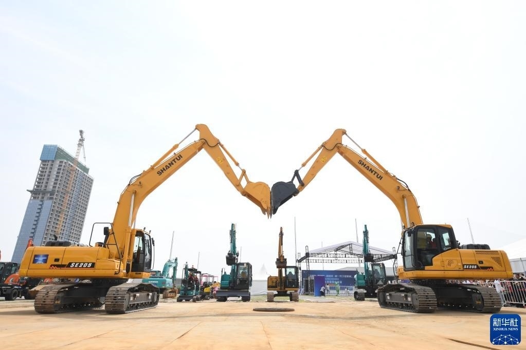 5月13日,在長沙國際工程機械展覽會上,機手駕駛挖掘機“比心”。