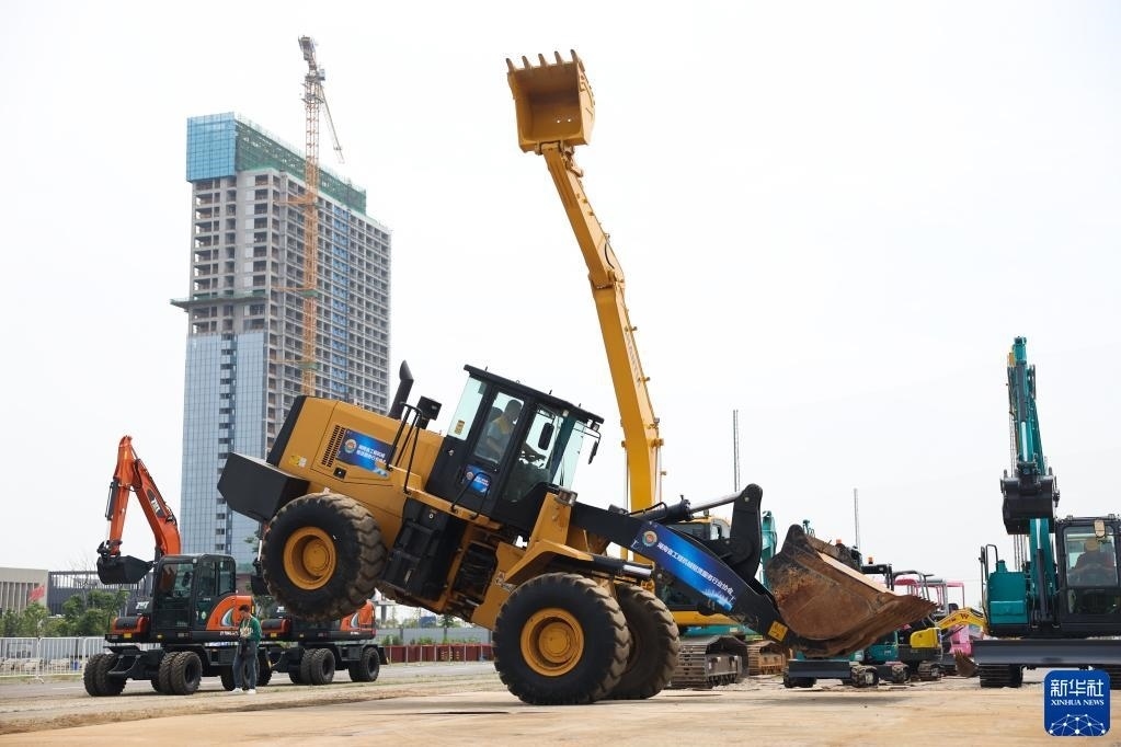 5月13日,在長沙國際工程機械展覽會上,機手駕駛裝載機表演。