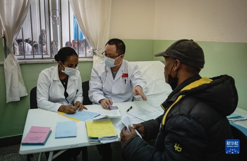 5月9日,在厄立特里亞首都阿斯馬拉的哈利貝特醫(yī)院,醫(yī)療隊(duì)隊(duì)長(zhǎng)、脊柱外科醫(yī)生朱振軍(前)為患者做檢查。