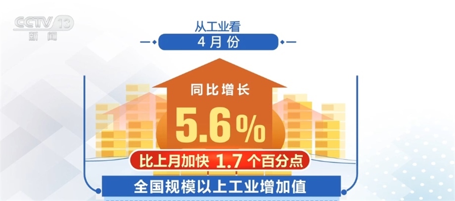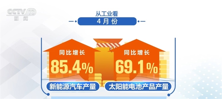 從工業(yè)看,4月份,全國規(guī)模以上工業(yè)增加值同比增長5.6%,比上月加快1.7個百分點,其中,新能源汽車、太陽能電池產(chǎn)品產(chǎn)量同比分別增長85.4%和69.1%。