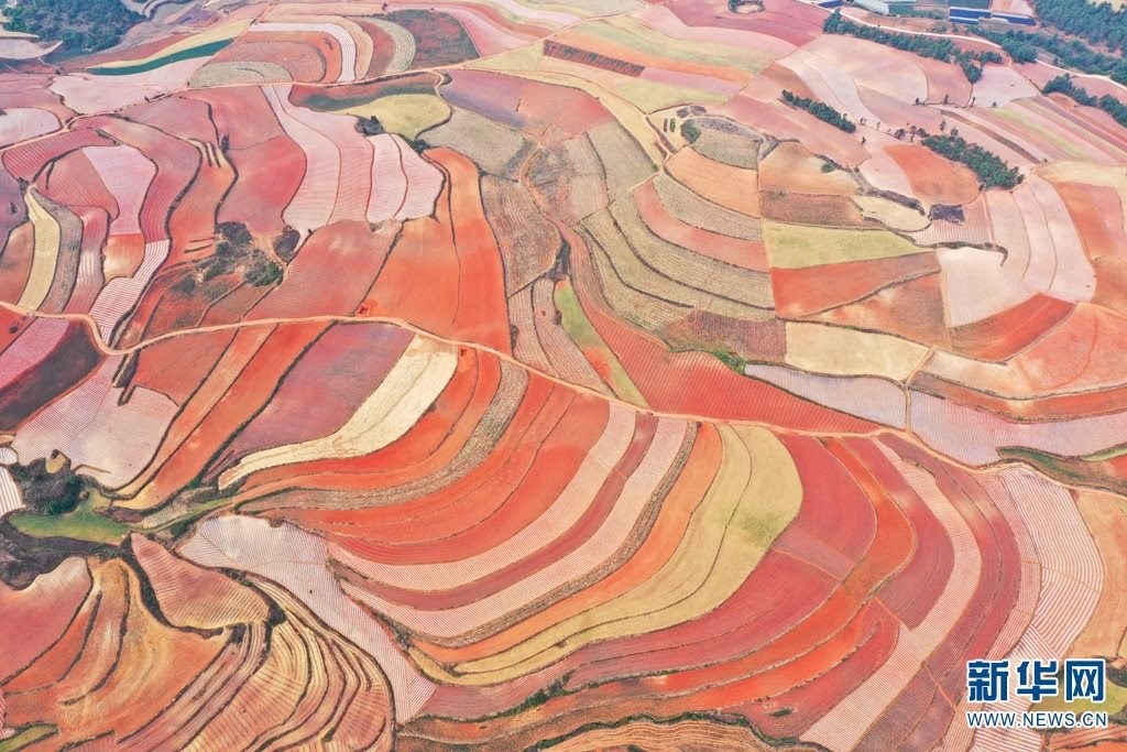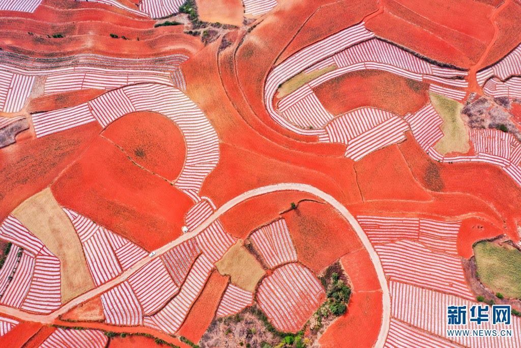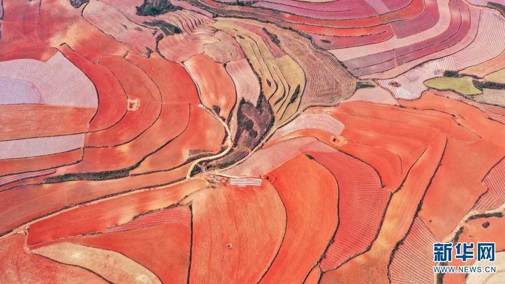 云南省尋甸回族彝族自治縣,連綿不斷的旱梯田遍布山間,遠(yuǎn)接天邊,每年4-5月,經(jīng)過村民翻新、平整后的紅褐色土地,從空中俯瞰五彩斑斕、蔚為壯觀。當(dāng)?shù)卮迕裥燎诟旁诜饰值募t土地上,用勤勞的雙手,繪就一幅幅勞動(dòng)藝術(shù)畫作。新華網(wǎng)發(fā)(孫文來 攝影報(bào)道)