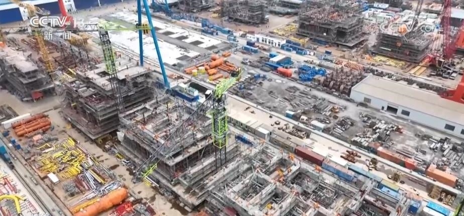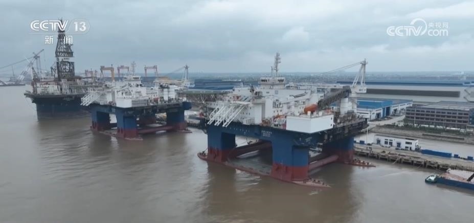 這些大家伙,都是世界技術(shù)比較領(lǐng)先的一些海工裝備。通過航拍的鏡頭,給大家展現(xiàn)一下,最遠(yuǎn)的是圓筒形超深水鉆探平臺(tái)。因?yàn)樗耐庑问仟?dú)特的圓筒型設(shè)計(jì),所以它的抗風(fēng)浪性、作業(yè)水深的能力非常得好,技術(shù)指標(biāo)創(chuàng)下多項(xiàng)世界第一。這家企業(yè),一共向國外交付了6艘同類型的產(chǎn)品。