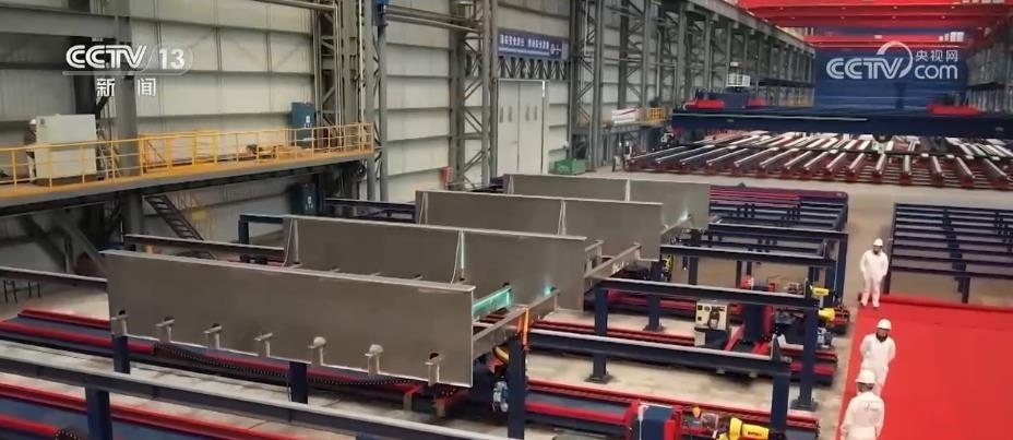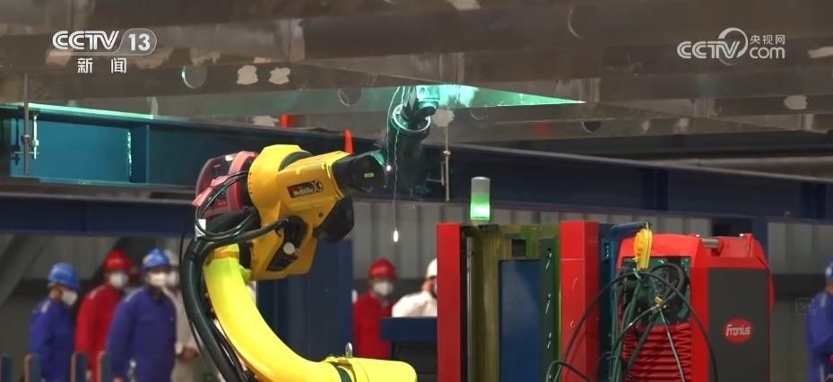 記者來到這個(gè)剛剛建成不久的智能化造船車間,一臺(tái)臺(tái)焊接機(jī)器人,正在自主完成作業(yè)。