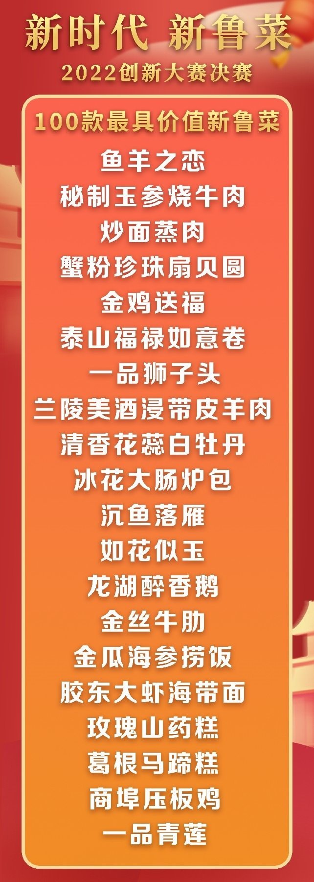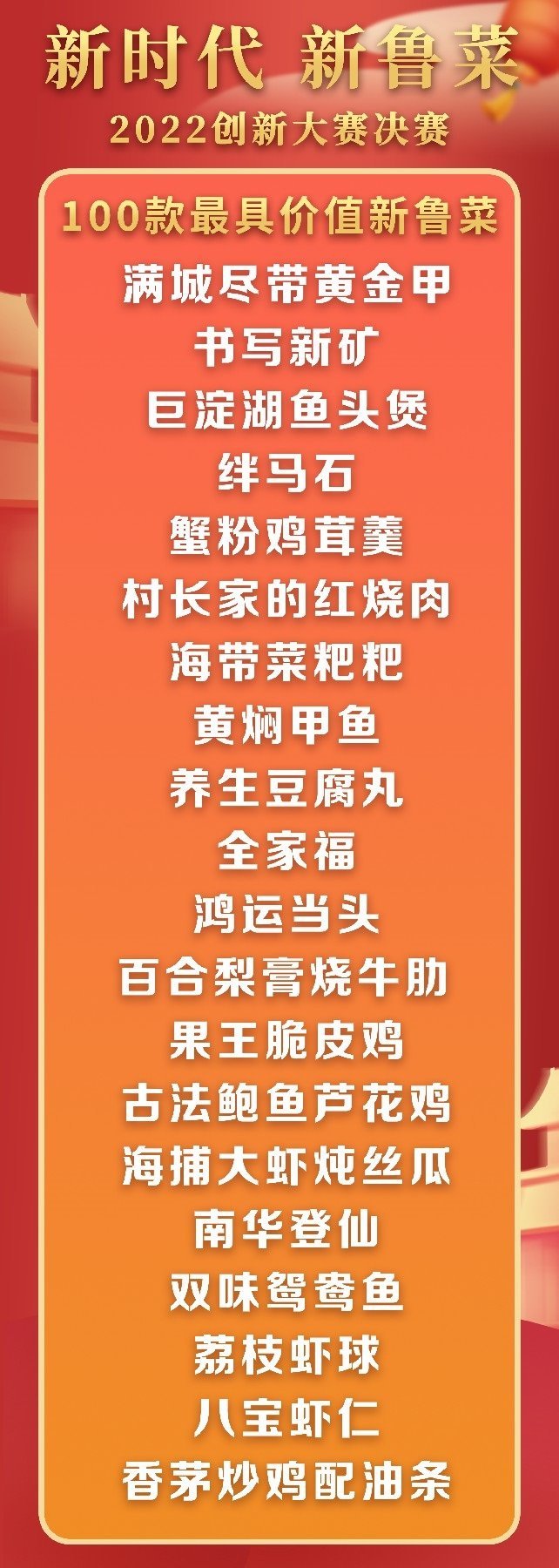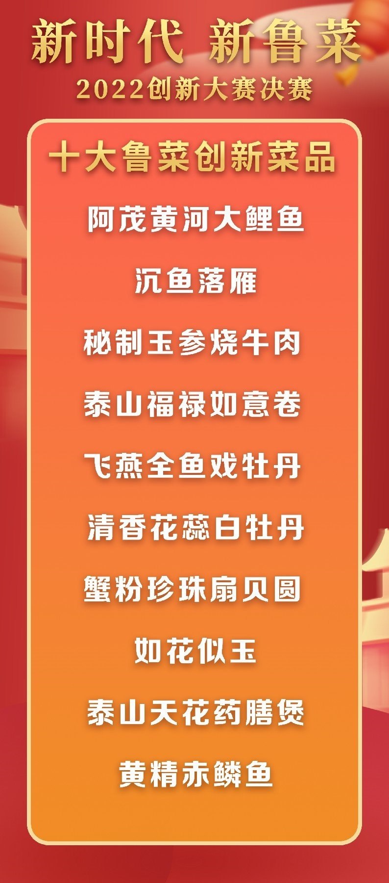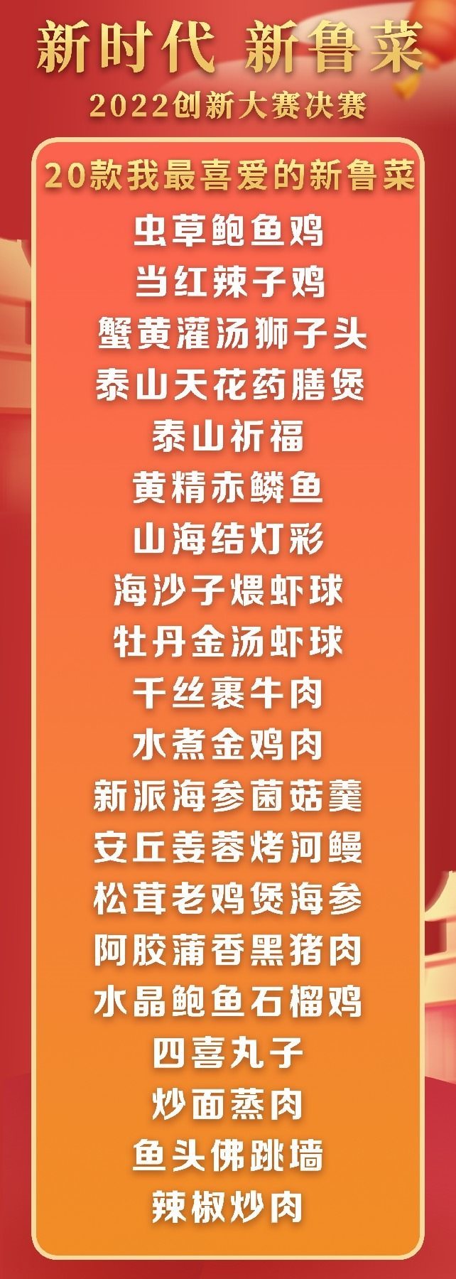 5月18日至19日,“新時代 新魯菜”2022創(chuàng)新大賽決賽暨頒獎活動在山東省濰坊市峽山區(qū)成功舉行,標(biāo)志著本屆大賽圓滿結(jié)束。經(jīng)過激烈角逐,大賽最終頒發(fā)出2022年度“十大魯菜創(chuàng)新菜品”、“20款我最喜愛的新魯菜”、“100款最具價值新魯菜”、“十大創(chuàng)新面點(diǎn)”、“預(yù)制菜轉(zhuǎn)化創(chuàng)新獎”和“海外最佳傳播獎”等獎項(xiàng)。此外,大賽組委會還頒發(fā)了“最佳組織獎”、“融媒貢獻(xiàn)獎”和“特殊貢獻(xiàn)獎”等獎項(xiàng)。