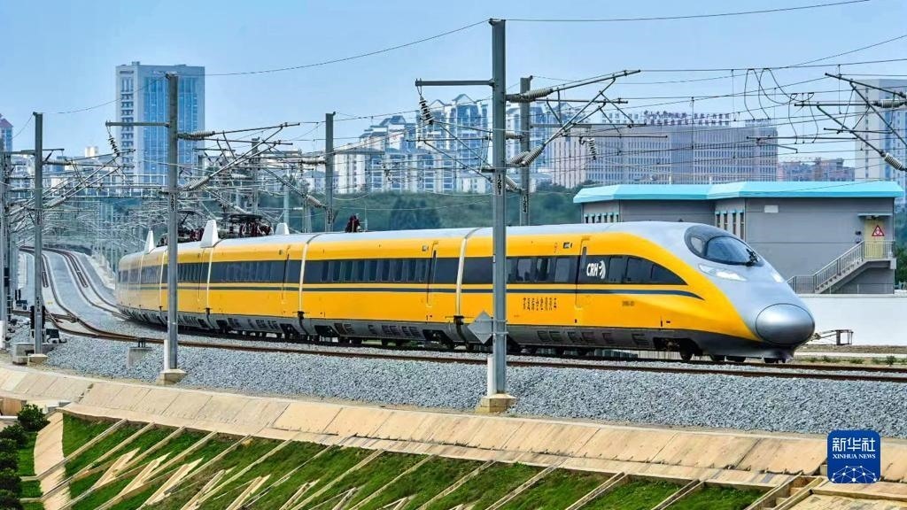 當日 ,CRH380AJ-0203高速綜合檢測列車對貴南高鐵全線進行逐級提速試驗,以時速180公里的速度級,對南寧東至荔波站區(qū)間高鐵沿線的軌道、信號、通信、電務、綜合接地等多個項目進行檢測。列車因車身涂裝成醒目的黃色,又被稱為“黃醫(yī)生”。