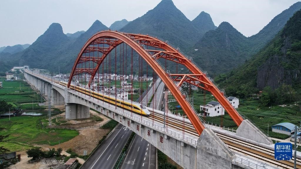 5月16日,高速綜合檢測列車行駛在貴南高鐵上進行檢測工作(無人機照片)。