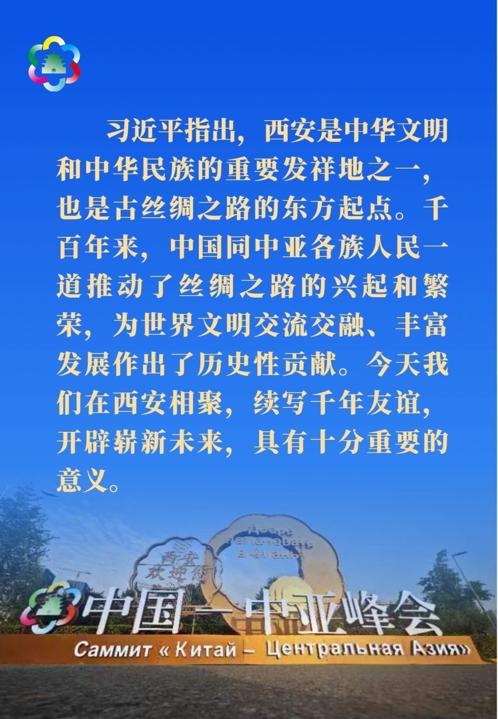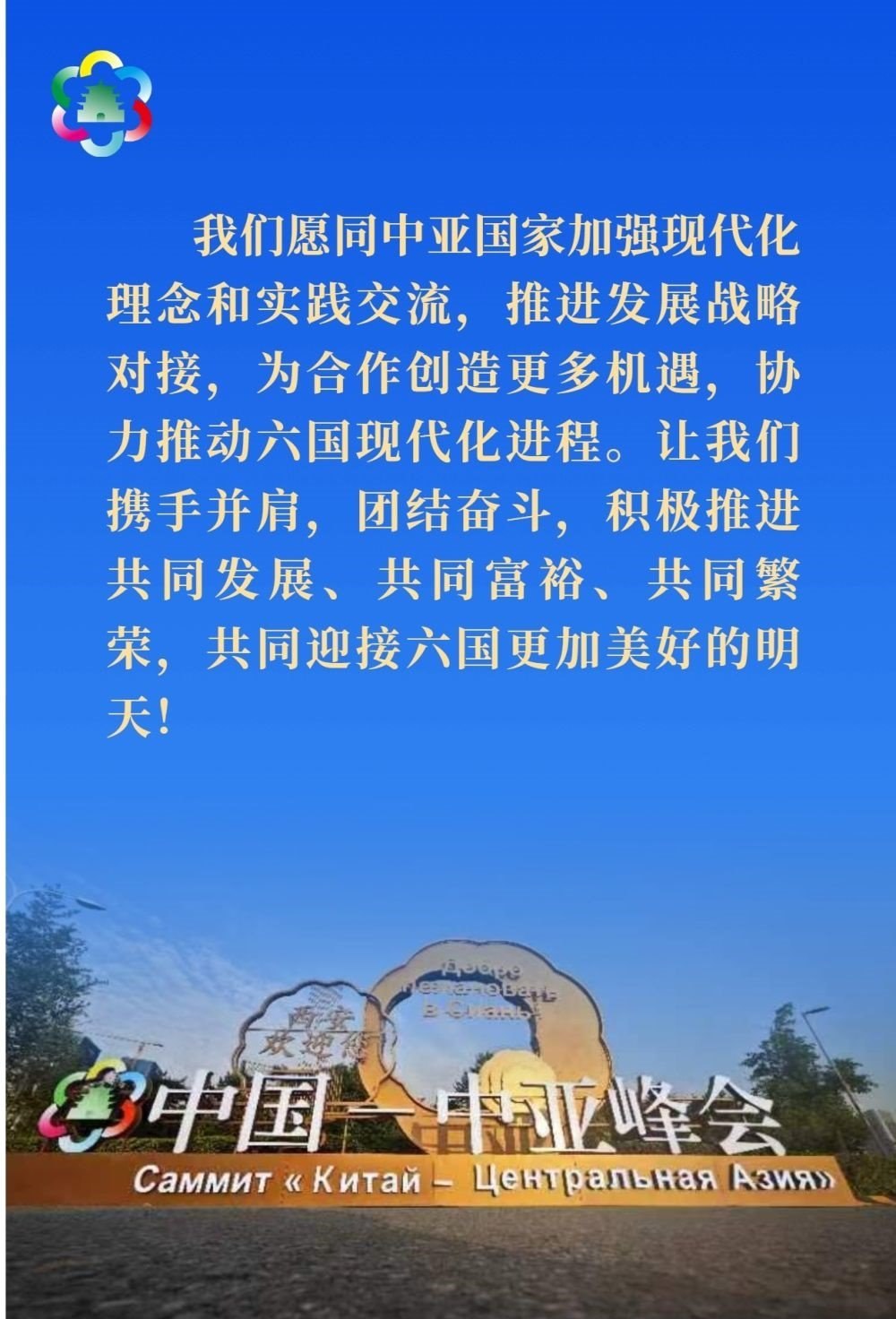 習近平發(fā)表題為《攜手建設守望相助、共同發(fā)展、普遍安全、世代友好的中國-中亞命運共同體》的主旨講話。