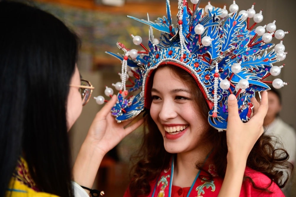 在青島的中國石油大學(華東)大學生活動中心,哈薩克斯坦留學生珍珠體驗京劇文化(2018年5月3日攝)
