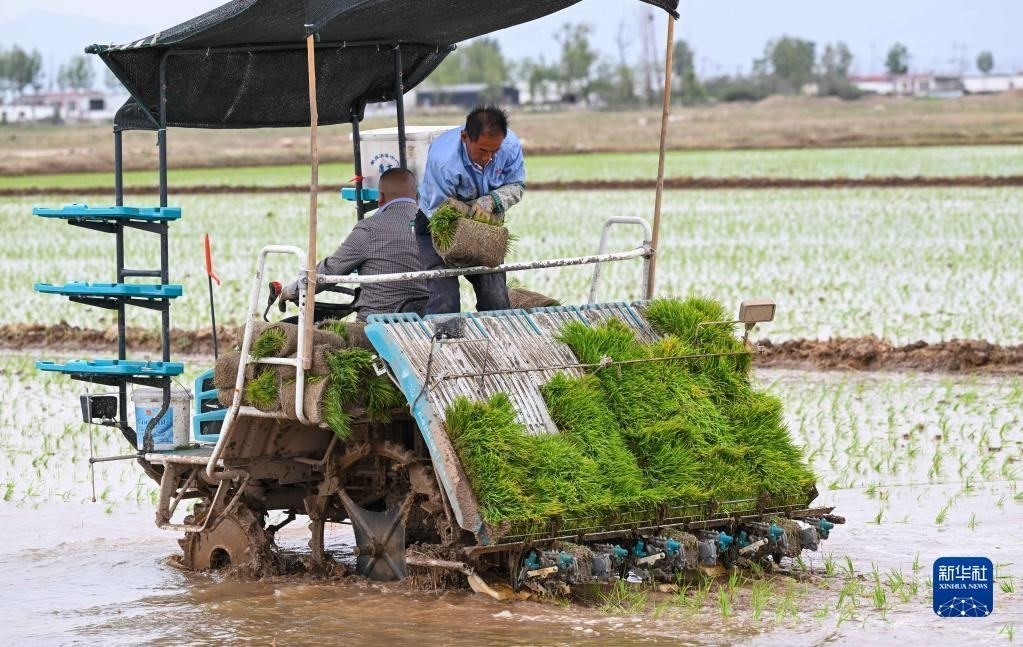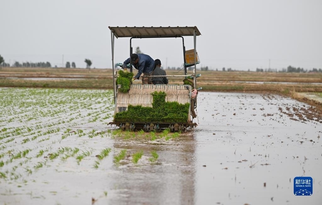 5月23日,達拉特旗昭君鎮(zhèn)村民在鹽堿地改良水稻田中使用農(nóng)機插秧。