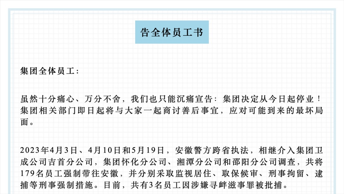 ·“催收巨頭”湖南永雄發(fā)布停業(yè)消息后又撤回,自稱179名員工被采取刑事強制措施。警方回應(yīng):該案件正在進一步偵辦中。