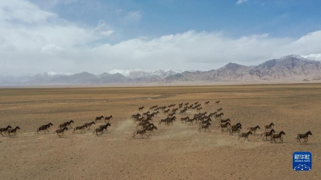 一群藏野驢在阿爾金山國家級自然保護區(qū)奔跑(5月23日攝,無人機照片)。