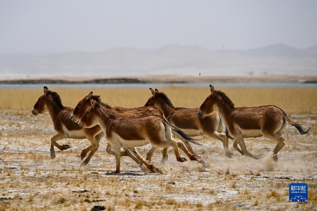 一群藏野驢在阿爾金山國家級自然保護區(qū)奔跑(5月23日攝)。