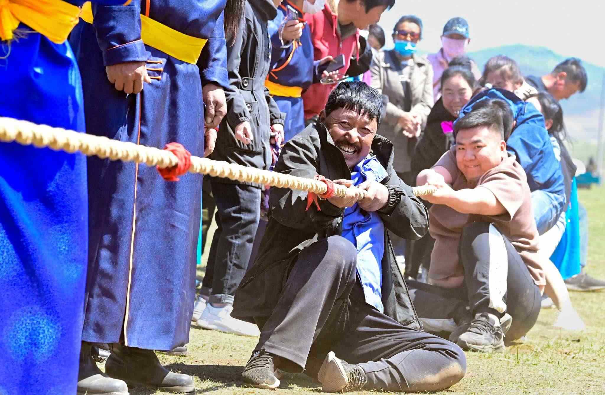 2023年5月26日,內(nèi)蒙古興安盟,科爾沁右翼前旗德伯斯鎮(zhèn)阿日林一合嘎查舉行首屆那達(dá)慕,設(shè)置的賽馬、布魯、搏克、拔河等傳統(tǒng)體育娛樂項(xiàng)目,吸引嘎查周邊500余名牧民參加比賽,喜慶牧業(yè)豐收季。視覺中國