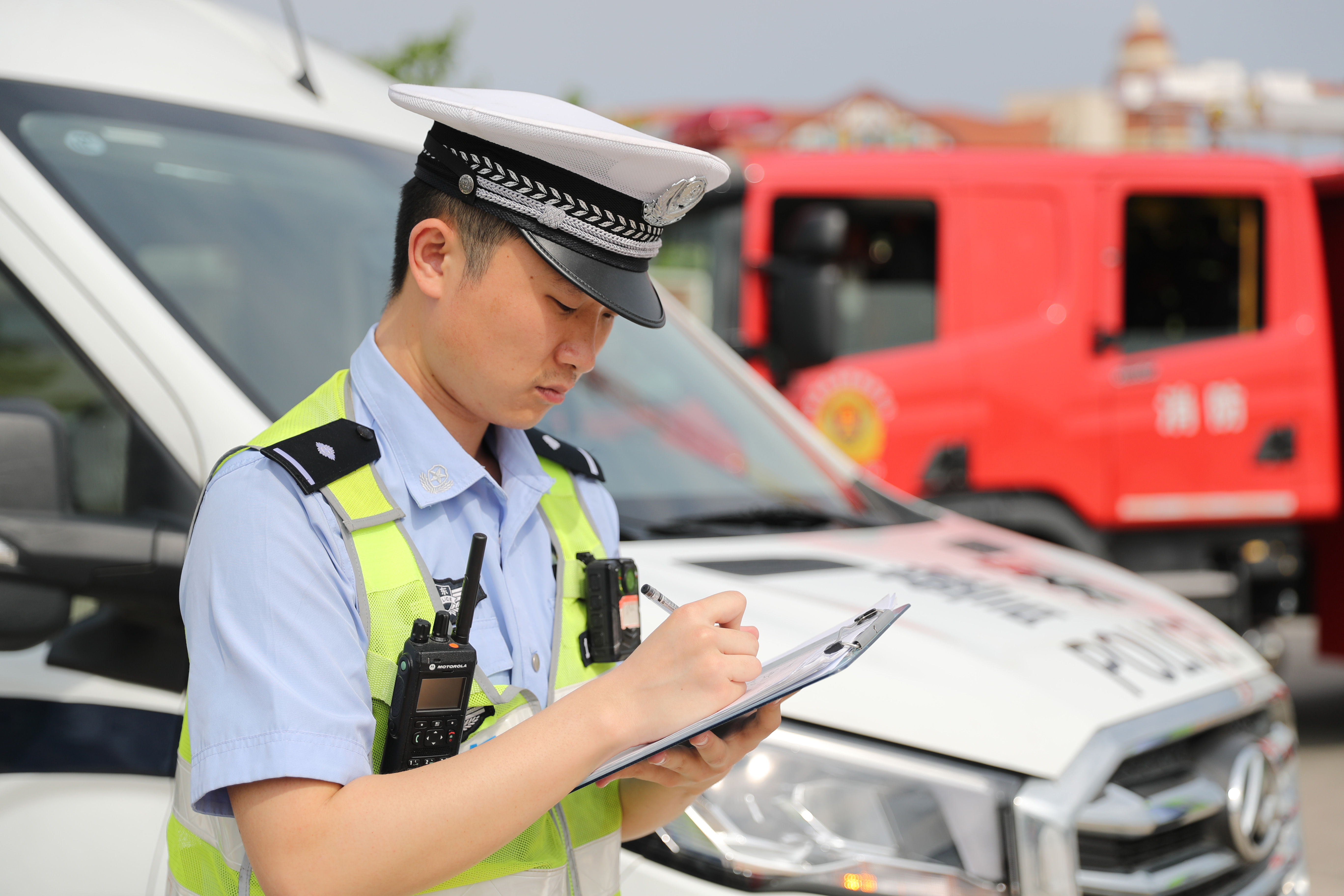 5月30日,交警在演練現(xiàn)場做案情記錄。(張進(jìn)剛 攝)