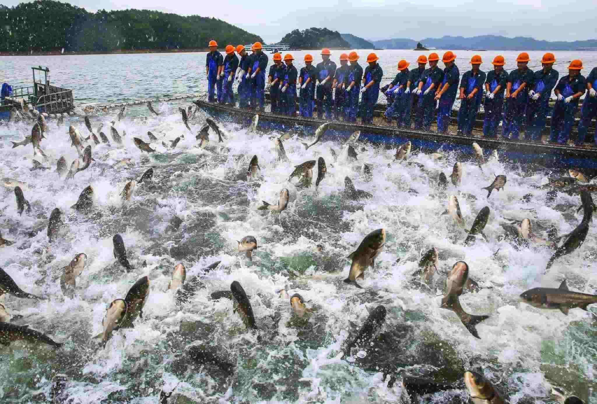 2023年5月31日,杭州,淳安縣千島湖小金山水域再現(xiàn)“巨網(wǎng)捕魚(yú)”盛景,萬(wàn)魚(yú)群躍,場(chǎng)面壯觀。視覺(jué)中國(guó)