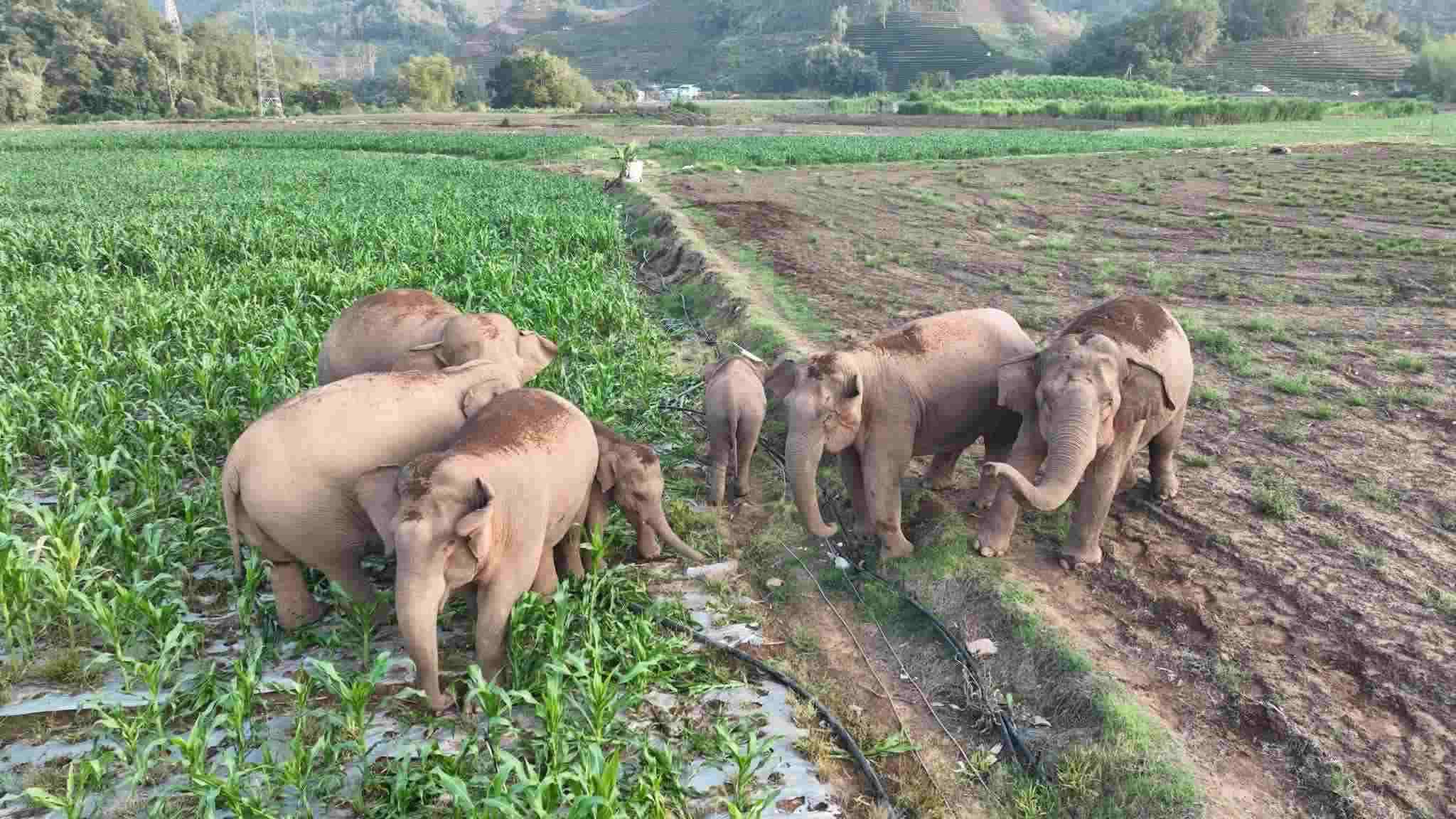 2023年5月17日,云南普洱,亞洲象群出山覓食戲水。視覺中國