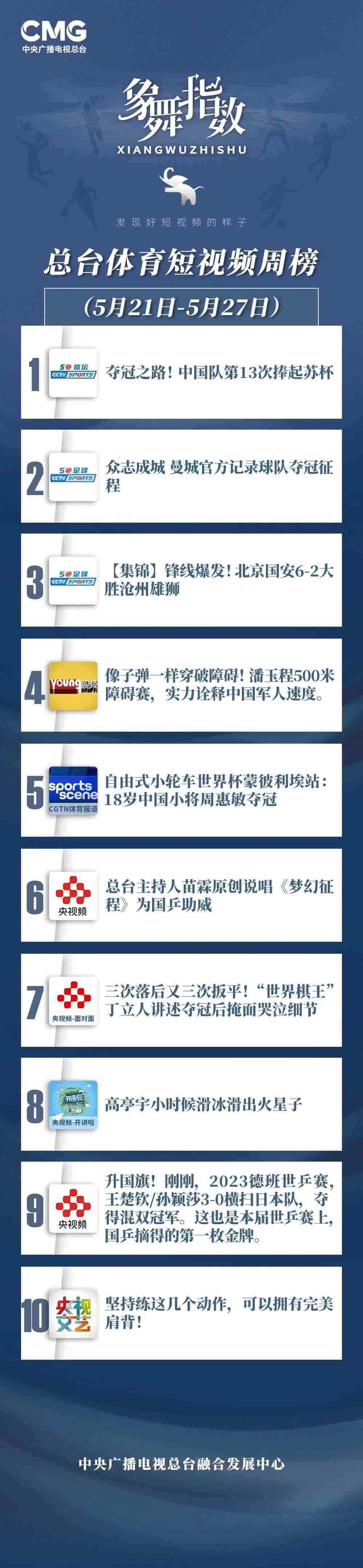 中央廣播電視總臺(tái)“象舞指數(shù)”評議品牌,推出體育短視頻周榜、總臺(tái)體育短視頻周榜。在5月21日—5月27日,以下內(nèi)容獲得矚目: